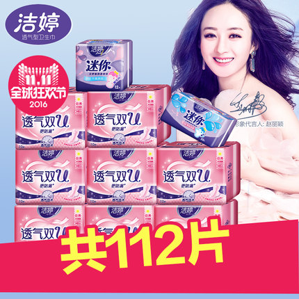 洁婷卫生巾混合装,纤巧棉柔,持久透气,双层瞬吸,更防漏 ,共112片,天猫劵后58元包邮。
