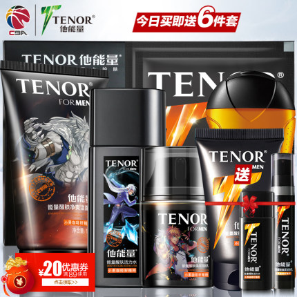 他能量男士护肤套装,内含:包含:洁面乳150g+爽肤水100ml+面膜*2片+润肤露50g+沐浴露100ml+洁面乳60g+润肤乳10g+活力水15ml。某猫旗舰店现售价89元,领取50元优惠券(点此领券),实付39元包邮到手。