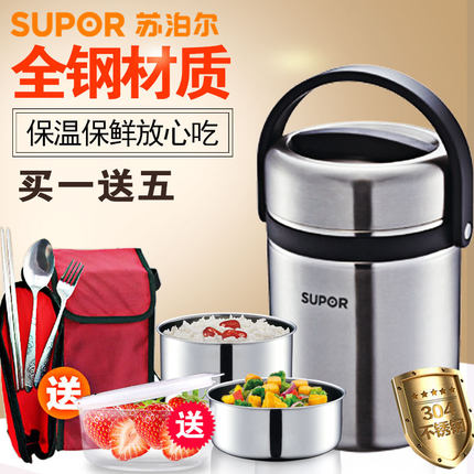 苏泊尔 304不锈钢保温饭盒1.5L KF15A1,全钢材质,304不锈钢内胆,支持保温或保冷,易清洁耐腐蚀。采用食品级硅胶防溢盖,三层分隔,1.5L适合单人使用。