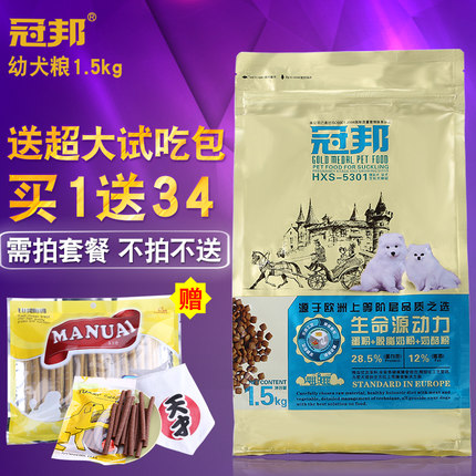 冠邦 通用型 宠物天然粮 1.5kg,天然狗粮,补钙美毛,调理肠胃。 天猫有商家报价59元,可用40元券,实付19元包邮,月销量330件。