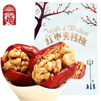 狗头 陕西特级红枣夹核桃仁,250g,枣香仁脆,美味对对碰舌尖上的美味,满足你挑剔的味蕾,精选高颜值新疆若羌红枣与大核桃,核桃肉厚酥脆,红枣软浓香甜,双重营养,一次补充。