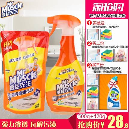 威猛先生 厨房 油污清洁剂 500g+420g补充装,买就送百洁块 ,超强去污,清香不刺鼻。 天猫有商家报价28.8元,劵后实付23.8元包邮。