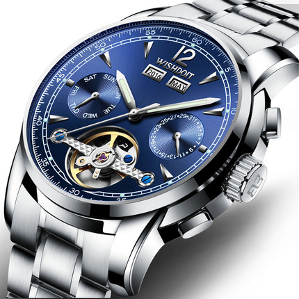威思登全自动机械防水男士手表,机芯类型: 机械表,表壳材质: 精钢,表带材质: 精钢,蝴蝶双按扣,矿物强化玻璃镜面,强夜光,30米生活防水,魅力非凡,这是潮男的共同选择,质保送皮表,男士必备哦!