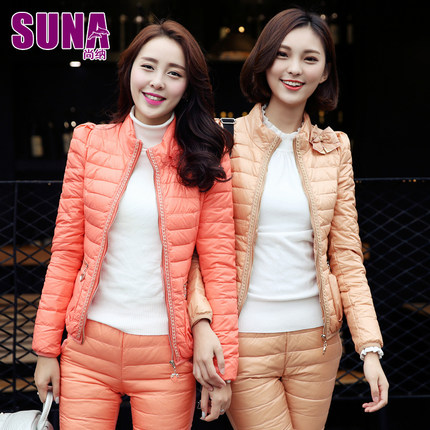 韩版蕾丝羽绒服羽绒裤套装 优质面料,含,绒量: 90%柔然舒适,保暖修身,颜色靓丽,气质优雅,蕾丝装饰,双层拉链,纯天鹅绒制作。券后99元包邮