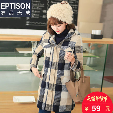 衣品天成 女士冬季格子毛呢长款连帽外套 59元包邮