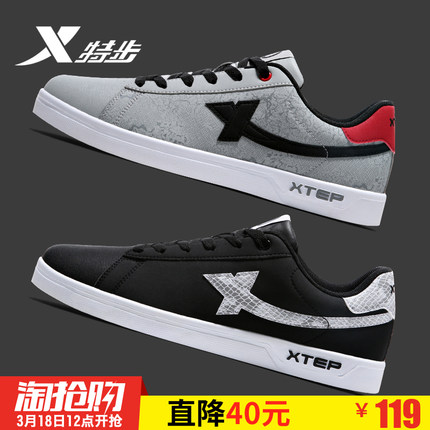 特步 男士 休闲板鞋,合成革帮面材质,耐磨橡胶底,缓震防滑,柔软舒适,吸湿透气,酷玩街头,韩版潮FUN,潮流时尚。 天猫有商家报价139元,使用30元券,实付109元包邮,月销量1635件。