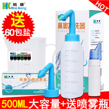 皓康 洗鼻器套装,包含500ml洗鼻壶+60包盐+三孔头+单孔头+量杯、喷雾器、体温贴, 天猫有商家报价39.9元,可用20元券,实付19.9元包邮。有助于改善鼻炎、流行性感冒、鼻塞难受、鼻干鼻痒、咽喉炎等。