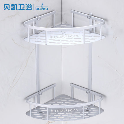 该款贝凯 浴室太空铝双层置物架,双层太空铝3302结构,高35cm,栏高5cm,采用免钉胶安装,免去打孔的麻烦。天猫店领取5元优惠券后第一款售价8.8元包邮。