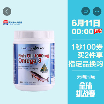 【Healthy Care Omega-3深海鱼油软胶囊1000mg*400粒 59包邮(¥99-40)】