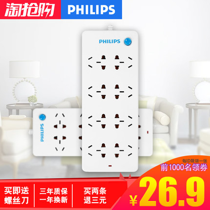 飞利浦 8位 排插 1.8米 ,一体芯技术,节能安全高温阻燃外壳,经久耐用,大孔距设计,安全易插。商家报价29.9元,使用3元券,实付26.9元包邮