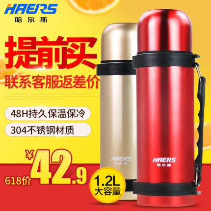 【哈尔斯 1.2L大容量不锈钢保温壶HY-1200W 送杯刷杯带 4色¥39包邮(¥69-30)】