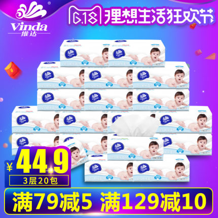 维达 婴儿抽纸,全新绵柔工艺,手感更加细腻柔韧,呵护宝宝娇嫩的肌肤。商家报价45.9元,使用3元券,实付42.9元包邮