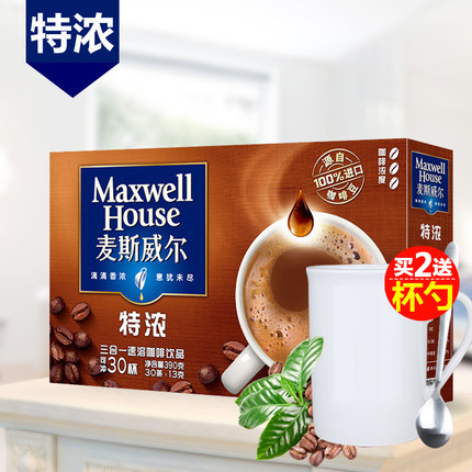 麦斯威尔 咖啡粉特浓三合一 即速溶咖啡正品盒装30条共390g,精选上等咖啡豆,精心调制,入口软滑不涩口,提神解困佳品。卷后19.9元包邮,2份送杯勺 。