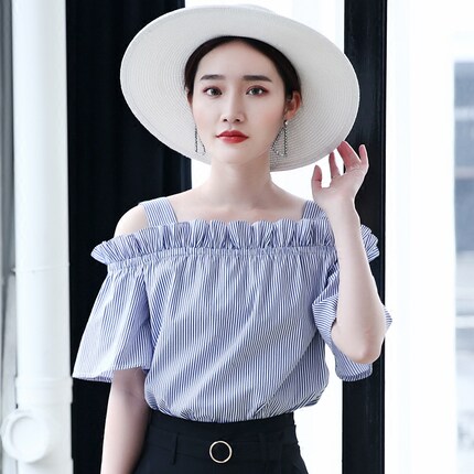 后恋 女士 休闲一字领露肩上衣,喇叭袖+一字露肩,清凉性感,经典条纹,休闲雅致。