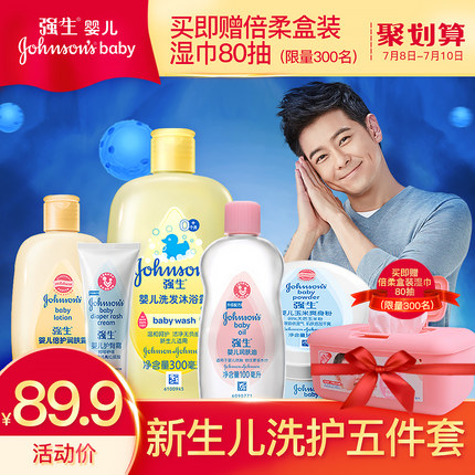 强生婴儿 新生儿 洗护套装 5件,包括:玉米爽身粉140g,护臀霜45g,润肤油100ml,洗发沐浴露300ml,保湿润肤霜200ml;。采用植物精粹,温和亲肤无泪配方,使用起来更加安心,倍润滋养。