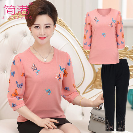 中老年女装妈妈装雪纺宽松上衣+裤子两件套,3D立体裁剪,修身显瘦,精选舒适优质面料,亲肤,透气。 做工精致,精工缝制,衣服烫金设计,袖口收口设计,尽显妈妈的时尚优雅气质。