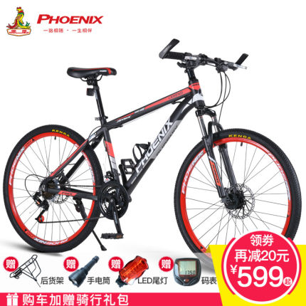 凤凰自行车山地车男女式学生越野单车,高碳钢车架,双碟刹制动系统,加强筋设计,防滑轮胎,时尚多变的外型装饰,骑乘舒适的避震系统,操纵自如的刹车系统。多重配置选择,男女式山地车。