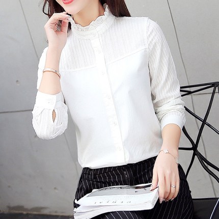 宽松【学院风-长袖】荷叶白衬衫 ,柔美的木耳领,提花面料,纯棉舒适,时尚文艺,舒适百搭的版型,给你不一样的气场,尽显女性睿智的风采【送运费险】