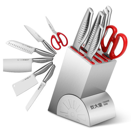 炊大皇 厨房刀具,7件套明细:砍骨刀、切片刀、多用刀、水果刀、磨刀棒、剪刀、刀座。采用优质不锈钢,刀身全钢制造,冰锻回火工艺,刀锋持久锋利。德国工艺,切削如风,刀锋所向,利不可挡,乐享轻松料理,炊大皇,贴心。