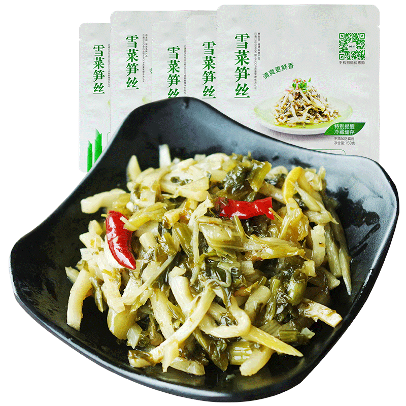 栖息园 爽口雪菜笋丝,雪菜、鲜笋和干辣椒的组合,目前天猫栖息园旗舰店158g*6 袋装售价¥24.9,可领取5元优惠券,实付¥19.9包邮,笋丝清脆爽口,可做生食也可做配料。
