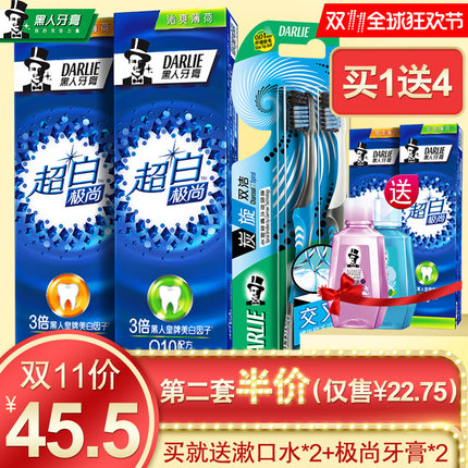 【【darlie黑人旗舰店】超白极尚牙膏牙刷套装【送漱口水50ml*2瓶+牙膏40g*2只】券后35.5元包邮,第2套半价只要22.75】