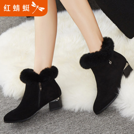 红蜻蜓女靴加绒毛款式,兔绒毛鞋面,内里高品质加绒保暖。防滑防震橡胶鞋底,2017冬季新款上市。