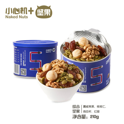 目前天猫商城小心机旗舰店罐装210g,售价¥49,可使用店铺¥30优惠券,实付¥19包邮,精选特级果仁,颗粒饱满,内含夏威夷果,核桃仁,南瓜籽三种坚果与红提的合理搭配,低温烘焙