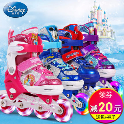 这款迪士尼直排溜冰鞋儿童全套装,天猫商城广东麦斯卡官方旗舰店单闪+全套护具款售价¥229,可领取店铺¥100优惠券,券后实付¥129包邮到手,并送单肩包+袜子,另外还有双闪、全闪可选