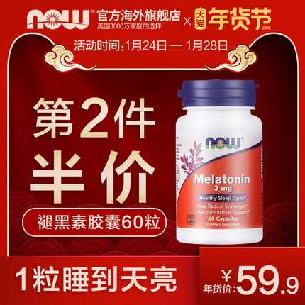 NOW 诺奥 褪黑素胶囊3mg*60粒,不含大豆、鱼类、麸质等过敏源,每一粒胶囊含褪黑素3mg,可以改善内分泌系统的功能,售价¥59.9,可使用店铺¥30优惠券,实付¥29.9包邮包税,安神助眠,增强免疫能力。