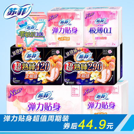 SOFY苏菲卫生巾日夜用超值61片,关晓彤倾情推荐,亲体设计,紧贴生理曲线,持久干爽透气,透气由里至外,快速吸收,令肌肤干净如初,周期组合套装。
