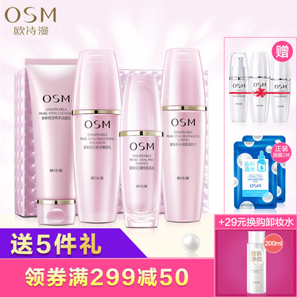 欧诗漫的悦活冬季补水水乳套装,由Angelababy代言,珍珠净化,杨处红润光泽肌。珍珠中含多种氨基酸及微量元素,温和亲肤,排浊提亮,打造粉嫩肌,所有肌肤适用。基本套餐包括洁面乳,活肤水和嫩肤乳。