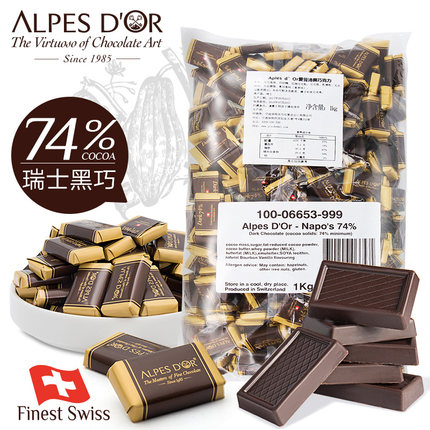 这款爱普诗 Alpes d’Or 纯黑巧克力块,瑞士进口,精选UTZ认证的可可豆制成,可可脂含量74%,不含代可可脂,味道有点苦,但香气怡人,口感醇厚,旗舰店178元,可用20元券,实付158元