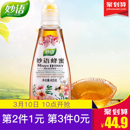 妙语旗舰店405g售价¥44.9,第二件1元,第三件0元,还可使用¥20优惠券,下单3件实付¥25.9包邮,折合每瓶¥8.6好价,春天更需要来点蜂蜜滋润。