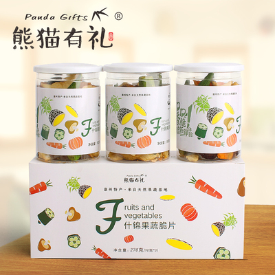 熊猫有礼商城90g*3罐礼盒装,售价¥58,可使用店铺¥20优惠券,实付¥38包邮,多口味可选,8种果蔬可口脆片,8种营养搭配,采用双渗双透脱水工艺,不含色素、防腐剂。
