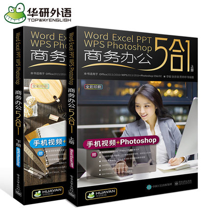 商务办公超强5合1,全彩印刷+图文并茂,助你轻松掌握5大办公软件Word,Excel,PPT,WPS,Photoshop,让你的idea尽情展现!