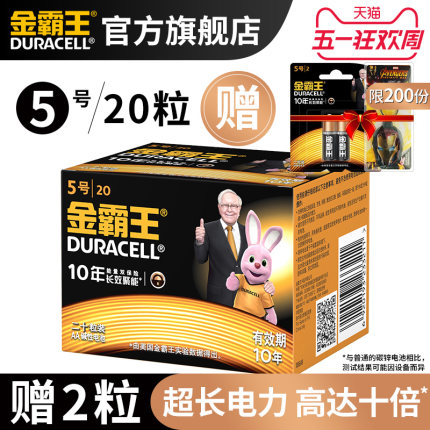 金霸王碱性电池干电池20粒,稳定电压,无汞无镉更环保,特有密封防漏技术更安全,品质出众持久电力,巴菲特旗下公司产品,某猫品质保证,更享10年保质期!