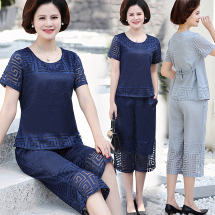 非常有气质的一款妈妈装,短袖七分裤两件套,剪裁宽松大方,修身有型,面料柔软透气,有光泽,质感舒适,复古回纹设计,优雅别致,袖口、裤腿镂空设计,透气大方。紫艾坊旗舰店78元,可领30元券,实付48元包邮。4色可选。