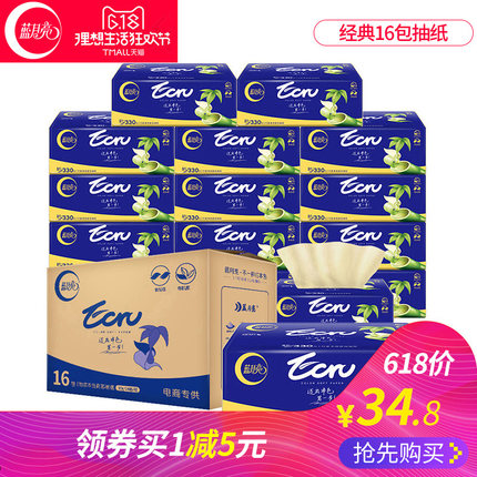 蓝月亮家居日用旗舰店3层110抽*16包,售价¥39.8,可使用店铺¥10优惠券,实付¥29.8包邮,食品级竹浆纸,竹浆本色,不添加不漂白健康环保,婴儿适用。