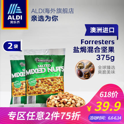 ALDI海外旗舰店盐焗混合坚果375g*2袋,售价¥39.9,可2件75折,还可使用店铺¥5优惠券,一次购买2件实付¥54.85包邮,折合¥27.4/件,保质期至10月,吃完不是问题。