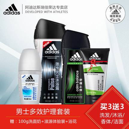 阿迪达斯 多效洗护套装 6件套,套装包含:沐浴露400ML+洗发露220ML+劲酷走珠50ML+洁面乳100G+滋源体验装+浴花。商家领券拍下49元包邮
