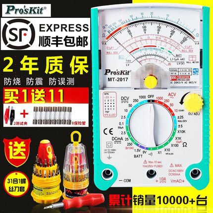 指针式高精度万用表,防烧,防震,防误测,人工设计,经典时尚,多重防护,买就送保险管8只,鳄鱼夹2只和31合一的螺丝刀组,速来抢购哦!