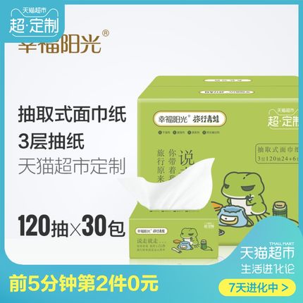 【10点开始: 幸福阳光 旅行青蛙 3层 120抽 30包 *2件 49.9元包邮(合24.95元/件)】