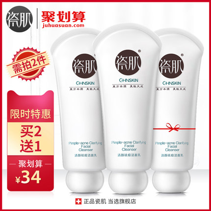 瓷肌 洁颜祛痘洗面奶100g,瓷肌为药妆大牌,此款天猫金妆奖人气单品,热销219万+件,含芦荟萃取精华、茶树、蜂王浆、甘草等,深层清洁配方有效控油,深度补水,适用于黑头、毛孔粗大、大油田、痘痘粉刺肌肤使用。售价34元,领取25元券,实付9元