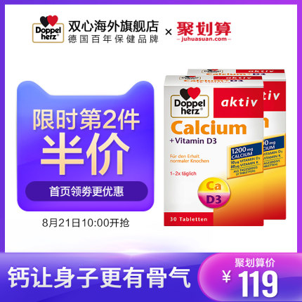【天猫国际好价:德国 双心钙片+D3 30片*2盒*2件 成人钙共4盒 劵后158.5元包邮包税】