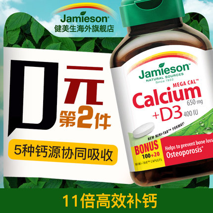 【神价 天猫国际2件49!健美生加拿大维D3钙片 120粒*拍2瓶=券后49元包邮,之前一瓶最低39】