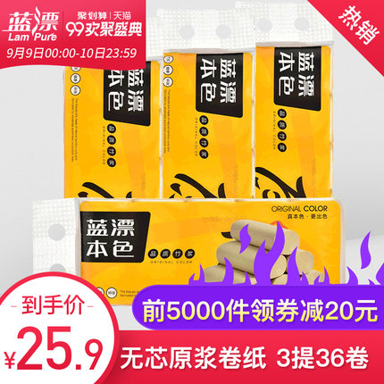 【蓝漂 本色 食品级不漂白无芯卷纸 加厚4层36卷 ¥26】