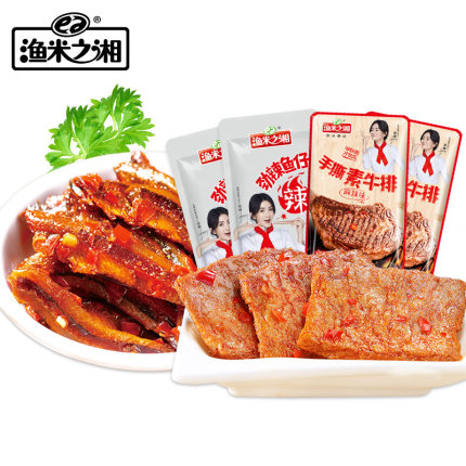 【渔米之湘 劲辣鱼棒小鱼仔 8g*10包+手撕素牛排 12g*10包 9.9元】