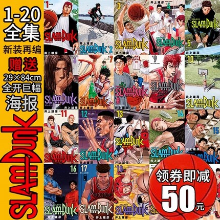 《灌篮高手》原单行本漫画共有31卷,本次再版在保留全部剧情的同时,将漫画整合成20卷的新装版本,再版的20卷漫画封面均由井上雄彦老师重新绘制,将用1~6、7~10、11~14、15~20卷分别讲述湘北篇、大赛前篇、大赛后篇、全国大赛篇。