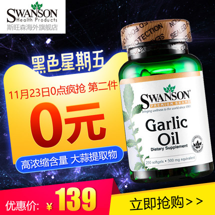 天猫swanson斯旺森海外旗舰店,139元黑五扫货价,满2件5折,下单2件,还可领20元优惠券,实付119元到手2瓶,这款SWANSON 大蒜素软胶囊,是美国原装进口,是从优质大蒜中提取其精华,500:1浓缩提炼制成胶囊,它保留了大蒜所有的天然成分,纯天然、高浓缩、脱臭处理无异味、食用方便、易吸收。具有活化细胞,促进能量产生,增加疾病抗菌能力,提高免疫力,预防感冒;能去脂降压、降血糖、保护肝脏,防癌、排毒清肠,调节肠胃等功效。适合免疫力差、三高、有幽门螺旋菌、糖尿病等人群使用。没日2-3次,每次1粒。