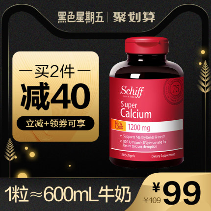 天猫Schiff旭福官方海外旗舰店,99元黑五扫货价,可领30元优惠券,69元包邮。这款Schiff 液体钙软胶囊,非钙片,美国原产,与普通钙片相比,液体钙不伤胃,同时小分子结构,更易于人体吸收;由于还添加了维D,更加促进了钙的吸收。青少年骨骼脆弱、成年人腰酸背痛、老年人骨质酥松,都是缺钙的表现,都可服用此液体钙软胶囊,可强健全身骨骼;每粒液体钙软胶囊,含钙1.2g、维生素800IU(国内汤臣倍健的含钙250mg、维生素D1.6ug),相差很大;每日2粒,单次或多次服用均可,孕妇和正在服药者忌服,规格是100粒。